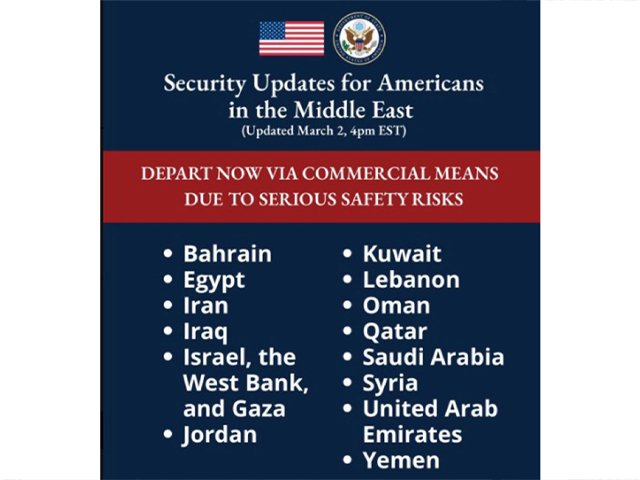 ਸੰਯੁਕਤ ਰਾਜ ਅਮਰੀਕਾ ਨੇ ਇਕ ਜ਼ਰੂਰੀ ਸਲਾਹ ਜਾਰੀ ਕੀਤੀ ਹੈ ਜਿਸ ਵਿਚ ਅਮਰੀਕੀ ਨਾਗਰਿਕਾਂ ਨੂੰ “ਗੰਭੀਰ ਸੁਰੱਖਿਆ ਜੋਖਮਾਂ” ਦੇ ਕਾਰਨ ਇਕ ਦਰਜਨ ਤੋਂ ਵੱਧ ਮੱਧ ਪੂਰਬੀ ਦੇਸ਼ਾਂ ਤੋਂ “ਹੁਣੇ ਚਲੇ ਜਾਣ” ਲਈ ਕਿਹਾ ਗਿਆ ਹੈ, ਕਿਉਂਕਿ ਈਰਾਨ ‘ਤੇ ਤਾਲਮੇਲ ਵਾਲੇ ਅਮਰੀਕੀ ਅਤੇ ਇਜ਼ਰਾਈਲੀ ਹਵਾਈ ਹਮਲਿਆਂ ਅਤੇ ਖਾੜੀ ਵਿਚ ਅਮਰੀਕੀ ਸਹਿਯੋਗੀਆਂ ਵਿਰੁੱਧ ਤਹਿਰਾਨ ਦੇ ਜਵਾਬੀ ਹਮਲਿਆਂ ਤੋਂ ਬਾਅਦ ਤਣਾਅ ਵਧ ਗਿਆ ਸੀ। ਐਕਸ ‘ਤੇ ਇਕ ਪੋਸਟ ਵਿਚ ਇਕ ਵੀਡੀਓ ਸੰਦੇਸ਼ ਸਾਂਝਾ ਕਰਦੇ ਹੋਏ, ਵਿਦੇਸ਼ ਮੰਤਰੀ ਮਾਰਕੋ ਰੂਬੀਓ ਨੇ ਆਪਣੇ ਨਾਗਰਿਕਾਂ ਨੂੰ “ਗੰਭੀਰ ਸੁਰੱਖਿਆ ਜੋਖਮਾਂ” ਦਾ ਹਵਾਲਾ ਦਿੰਦੇ ਹੋਏ, ਕਈ ਮੱਧ ਪੂਰਬੀ ਦੇਸ਼ਾਂ ਤੋਂ ਤੁਰੰਤ ਚਲੇ ਜਾਣ ਦੀ ਅਪੀਲ ਕੀਤੀ।